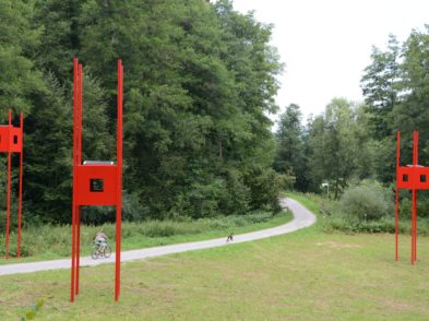 Direkt hinter unserem Gelände verläuft ein schöner Waldweg, den man zu Fuß oder mit dem Rad erkunden kann. Unterwegs finden sich immer wieder überraschende und mehr oder weniger abstrakte Skulpturen, die dem Projekt SCULPTOURA entstammen – eine Freiluftgalerie im Zusammenspiel von Natur und Kunst.